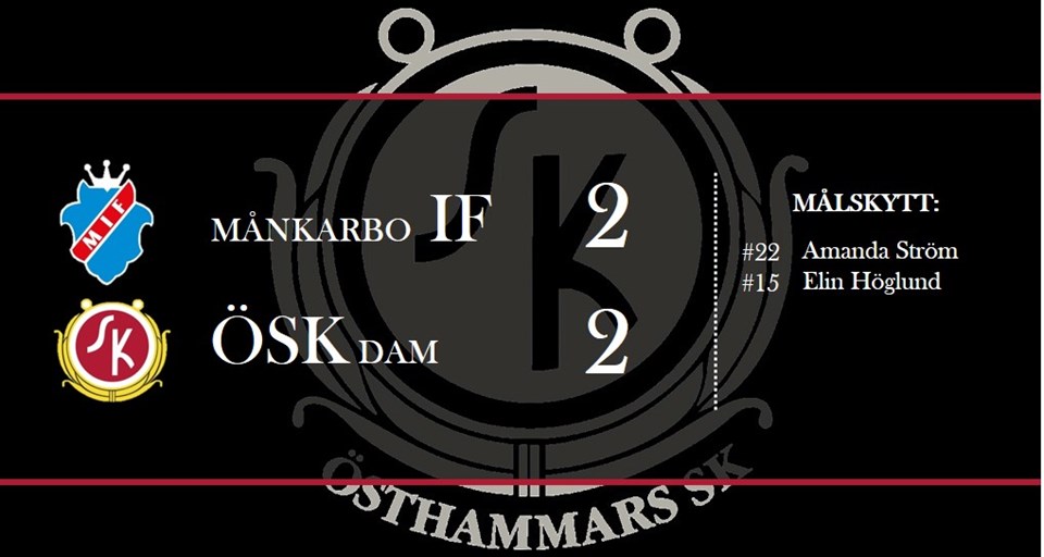 Med nån form av världsrekord i återbud stod ÖSK-dam för en riktig kämpainsats och lyckades spela oavgjort, 2-2, mot serieledande Månkarbo. Ett kryss som var endast fem minuter från seger… Första halvlek startar tjejerna betydligt piggare och mer aggressivt än tidigare matcher efter uppehållet. Kanske var det för att vi för dagen gått ifrån vårt vanliga 3-4-3 till klassiska 4-4-2 som koncentrationen var något högre. Efter knappa tio minuter spelade sätter Elin Höglund mer eller mindre på egen hand press på Månkarbos backlinje. Det resulterar i en halvdan rensning från deras målvakt som Wilma Andersson kan snappa upp. Wilma lyfter in bollen mot straffområdet och där möter Amanda Ström upp perfekt och pangar in 0-1 på volley upp i målvaktens högra kryss. Där efter får vi kämpa för att freda oss mot ett allt hungrigare hemmalag. Med ca 5 min orkar vi inte längre hålla emot och det är kvitterat, 1-1, vilket också blir halvtidsresultatet. Paussnacket andas optimism från framför allt tjejerna. Trots att vi fått kämpa för att freda oss har de märkt att Månkarbo är något tröga i sin backlinje så kan vi bara få upp bollen i banan finns hopp för ytterligare ÖSK-mål. Andra halvlek hinner sen också knappt börja innan Linnéa Oscarsson vinner boll resolut på egen planhalva. Hon får fram bollen till Amanda som hittar Elin Höglund med fart. En Höglund med fart är svår att stoppa även för den snabbaste backlinje så hon sprintar sig lätt förbi och rullar behärskat in 1-2 med en bredsida. Även denna halvlek pressar Månkarbo på för kvittering men känslan är ändå att vi har bättre kontroll och skapar väl så många chanser som hemmalaget. Med 5 minuter kvar får ändå Månkarbo sin chans efter att domaren blåst straff (som var svår att snacka bort). Inget misstag görs på den och 2-2 kommer upp på resultattavlan. Efter händelsfulla tilläggsminuter med chanser för både oss och Månkarbo blåser ändå domaren av matchen vid 2-2. Hemsidan brukar sällan höja individuella insatser men kan denna gång inte blunda för vår nykomponerade backlinje. Natha stänger sin högerkant briljant och är även med och vill starta vår offensiv. Tilde Eliardsson håller på att växa ut till en riktig ”chef” längst bak och Linnéa Oscarsson gör sin överlägset bästa match för året i sin roll som stötande framför Tilde. Till vänster hittar vi unga Linnea Schnell (född -03) som tidigare endast gjort sporadiska inhopp. Här startar hon mot serieledarna och efter att vant sig vid tempot nån kvart gör hon en alldeles lysande insats. Även Johanna och Lisa som avlastade i backlinjen gör varsitt gediget inhopp. Bredden är verkligen vår styrka! I div 5 blev det också kryss. Under fotbollens dag spelade tjejerna 2-2 mot Härnevi. Tjejerna hade det mesta och bästa av spelet men Härnevi är ett starkt fysiskt lag och hade nog de vassaste chanserna. Lovisa (född -04) i målet storpelade dock och på utespelarsidan hade vi ännu en debut i unga Elise Tillberg. Målen för ÖSK gjordes av Wilma och Lisa. Matcher denna vecka är hemma på lördag, 31/8, kl 16,30 mot Fanna för div 3-gänget. Och i div 5 åker vi under söndagen till Tierp för bortamatch mot Tierp 2. Tack för uppmärksamheten!! // ÖSK-dam