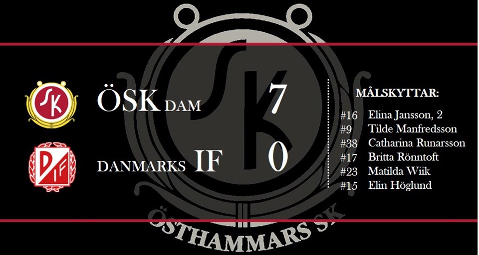 Värmen från premiärhelgen ville inte infinna sig till hemmapremiären men då även vinden uteblev var förutsättningarna för bra fotboll goda i Gimo under lördagseftermiddagen. Våra rödvita damer i ÖSK-dam var det lag som utnyttjade förutsättningarna bäst och vann till slut med hela 7-0 mot Danmarks IF. Första halvlek startade något hafsigt och trevande men efter att tjejerna fått "känna på motståndaren" en stund tog ÖSK-dam över mer och mer av bollinnehavet. När Elina Jansson behärskat placerar in 1-0 efter ca 20 min kunde man nästan se hur anspänningen släppte och tjejerna började spela ut ordentligt. Bara nån minut senare drar TT iväg ett skott som knappt orkade fram till målvakten men på vis ändå in i mål till 2-0 och redan där började matchen kännas klar. Innan pausvisslan ljöd hann tjejerna även med att göra 3-0 på årets första hörnmål då Cattis nickar in Tilde E´s perfekta hörna. Paussnacket handlade denna gång om att fortsätta anfalla så att vi inte hamnade i samma situation som uppe i Tierp och som tjejerna gjorde det... Andra halvlek var ÖSK-dams från första början. Ca tio minuter in i halvleken spelar sig tjejerna igenom Danmarks försvar och Britta står i princip bredvid målvakten när hon lägger in 4-0. Fem minuter senare gör Elina sitt andra för dagen fram till 5-0 och tre minuter senare placerar Wiiken in 6-0. Danmark började nu fokusera mer på domaren än sin egen insats och vi passar då på att låta alla vara med. Wilma kommer in med ca 30 minuter kvar och tio minuter senare kommer även Elin M, Lova och Lisa in från bänken. Alla inhopparna visar vilken bredd vi har för spelet är fortsatt kraftigt i ÖSK´s regi. Med tio minuter kvar avslutar Elin H målskyttet då hon rullar in 7-0 bakom en maktlös målvakt. En helt igenom solid insats från ÖSK-dam. Tjejerna har snabbt anpassat sig till tempot i div 3 (som är markant högre än i div 4) och visar tydligt att dem vill vara med och tävla. Nu väntar en spännande vecka som avslutas med del 1 i "Slaget om kommunen". Kan tjejerna skaka även Gimo? Absolut kan dem det men då krävs ännu en prestation i klass med de två de nu gjort. I div 5 åkte tjejerna till Härnevi med bara 13 tjejer efter sena återbud. Med tanke på att Härnevi inlett serien med tre raka segrar trodde vi nog att det skulle bli i tuffaste laget att komma dit med bara 13 tjejer. Men de här unga tjejerna överraskar oss ännu en gång och åker hem med tre poäng efter att ha vunnit med 1-2. Målskyttar här blev TT och Elsa. Grymt! Tack för uppmärksamheten / ÖSK-dam