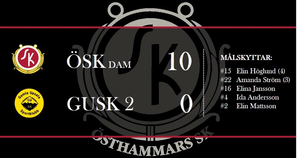 ÖSK-dam fortsätter att övertyga på hemmaplan i div 4. I den från premiären uppskjutna matchen mot GUSK2 som spelades under onsdagskvällen fick publiken uppleva ännu ett målfyrverkeri. Hela 10-0 slutade matchen. Matchen inleddes jämnt med två lag som inte gav sina motståndare en extra sekund med bollen vilket innebar ett ganska hafsigt spel på den fortfarande något studsiga IP. Efter ca 10 min hittar Elina ändå lite tid och slår en fin passning i djupled till anfallskollegan Elin H. Elin hinner precis före målvakten som ändå räddar men kan sen bara se på när Elin slår in returen till 1-0. GUSK fortsätter några minuter efter målet att försöka sätta hög press men 20 minuter in i halvleken känns det tydligt att ÖSK-dam tagit över taktpinnen och kommer i anfall efter anfall. I minut 22´kommer också 2-0 då Elina nickar in bollen efter en hörna. När sen Elina återigen passar fram Elin H till halvtidsresultatet 3-0 i matchminut 38´känns matchen redan avgjord och ledarna kan unna sig att vila Elinas stukade fot till den kommande matchen på lördag. Det som imponerar mest på ÖSK-dam 2018 är deras förmåga att bara ”trumma på”. I andra halvlek kör ÖSK-dam över GUSK-tjejerna ordentligt och bjuder på riktigt fin fotboll i kvällssolen. Målen kommer också i jämn takt och när matchen är över har Elin Höglund hunnit med att placera in fyra bollar. Även för Amanda Ström lossnade det till sist. Hon såg ut att ha ”en sån där dag” då bolluslingen bara inte ville in men från minut 81´till 87´ kom det. På bara 6 minuter hann hon med att avsluta matchen med ett äkta Hattrick. Nu laddar tjejerna om för en tuff bortamatch mot Märsta på lördag. Märsta som säkert vill ha revansch för 5-0 förlusten i kvalet till div 4 i höstas. Vill ni se fotboll på närmare håll så spelar även tjejerna hemma på IP lördag då Jomala besöker oss för en match i div 5. Matchstart 11.00. Målen mot GUSK: 1-0 Elin Höglund (ass Elina) Minut 9´ 2-0 Elina Jansson (ass Malin) Minut 22´ 3-0 Elin Höglund (ass Elina) Minut 38´ 4-0 Elin Höglund (ass Tilde E.) Minut 47´ 5-0 Ida Andersson (ua) Minut 60´ 6-0 Elin Höglund (ass Ida) Minut 64´ 7-0 Elin Mattsson (ass TT) Minut 72´ 8-0 Amanda Ström (ass Elin H.) Minut 81´ 9-0 Amanda Ström (ass Jossan P) Minut 85´ 10-0 Amanda Ström (ass Ida) Minut 87´ Är ni nyfikna på hur det går för tjejerna gör ni säkrast i att följa @oskdamfotboll på instagram och/eller ÖSK Dam Fotboll på facebook. Tack för uppmärksamheten / ÖSK-dam.