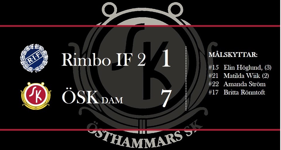Vilken premiär! ÖSK-dam fullkomligt kör över Rimbo IF 2 som förra året spelade i div 3 med hela 7-1. Första halvlek är till en början jämn spelmässigt med högt tempo och även en hel del tuffa närkamper där domaren tillät mer än vad vi kanske är vana vid. Varefter tiden går börjar ändå våra röd-vita hjältar ta över mer och mer av spelet. I matchminut 22´ kan vår nummer 22 Amanda Ström få in det förlösande första målet i efterdyningen av en frispark slagen av Natha. Tjejerna fortsätter efter målet att skaffa sig lägen men siktet är inte riktigt inställt och Rimbo är inte heller ofarliga, bl a gör Pillan en riktigt bra utrusning vid ett friläge. 0-1 står sig trots allt till paus. Andra halvlek blir sen rena målkavalkaden från ÖSK-dam. Den hinner knappt börja innan Elin Höglund gör sitt första för dagen, 0-2 i 47`. Bara fem minuter senare sätter Matilda Wiik dit 0-3 i sin första match på över 3 år. Tjejerna ”maler” mer eller mindre ner sitt motstånd och när kvarten återstår har Elin Höglund hunnit med att göra 0-4 i 64´ och Matilda fortsätter med 0-5 i 73´ minuten. Matchen känns i detta läge redan avgjord men tjejerna slår inte av på takten för det utan Britta Rönntoft ökar på till 0-6 i 80´ och Elin Höglund får sen avsluta med att fullborda sitt hat-trick fram till 0-7 i 84´ minuten. Rimbotjejerna blev allt mer trötta ju längre matchen led men fick ändå med sig ett mål då dem reducerar till slutresultatet 1-7 med två minuter kvar. Lite synd att Pillan inte fick hålla nollan men vad gör väl det en sån här härlig premiärkväll. Tjejerna visade verkligen sin bästa sida denna kväll. De stod upp i det fysiska spelet utan att för den skull tumma på det fina passningsspel dem skämt bort oss med. T o m ledarna för Rimbo berömde det fina spel laget presterat. Nästa match i div 4 blir hemma på IP Kristi Himmelsfärds dag torsdag 10 maj kl. 14.00 då ESK 2 kommer på besök. Boka in det redan nu. För div 5 gänget fortsätter seriespelet redan ikväll mot BKV Norrtälje på konstgräset i Gimo. Matchstart är kl. 19.00. MISSA INTE DET. Välkommen ikväll!!! Mer kommer på hemsidan under veckan. Tack för uppmärksamheten / ÖSK-dam.