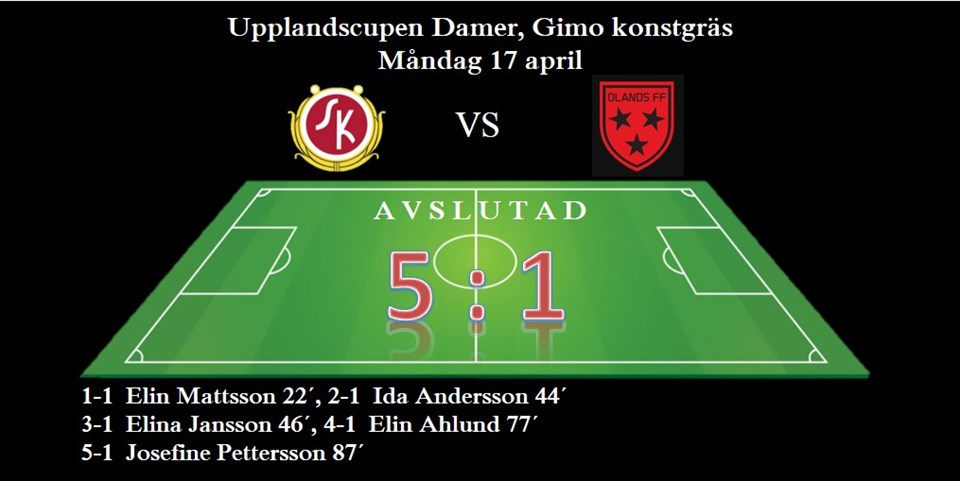 Sista matchen i Upplandscupens grundomgång blev en riktig ”fem-etta” för ÖSK-dam. 5-1 mot Oland innebär att ÖSK-dam nu är vidare till slutspel i Upplandscupen. Inför matchen var vi införstådda med att vi nog kommer tillåtas ha mycket boll och att det kommer att gå fort när Oland ställer om till anfall. Det fick vi bittert erfara redan efter ca 10 minuter då Olands vindsnabba forward springer sig fri från nästan halva plan och rullar in 0-1 bakom Pillan. Tjejerna behåller trots målet lugnet och fortsätter att metodiskt ”mala ner” Oland med säkert passningsspel. Dock har vi svårt att lyckas få till de riktigt heta chanserna. I minut 22´får vi en frispark en bit utanför Olands straffområde och Elin M sätter snyggt dit kvitteringen ribba in. Vi fortsätter att anfalla men får vänta ända tills matchminut 44´ innan Ida från snäv vinkel hittar bortre burgaveln. 2-1 och ledning i halvtid. I halvtid pratar tjejerna själva om att vi kanske försöker spela lite väl mycket efter marken och vi kommer överens om att försöka med några längre bollar då och då. Andra halvlek hinner knappt börja innan Ida med en perfekt ”långboll” hittar vår vindsnabba forward Elina som inte gör något misstag utan rullar in 3-1 in minut 46`. Resten av halvleken blir sedan en enahanda historia där vi anfaller och Oland försöker ställa om på kontringar. Men i andra halvlek har vi bättre koll på deras forward och närmare än en hörna kom dem inte målet. Starkt gjort ändå av Pillan att stå i shorts hela matchen. Även framåt spelar vi väldigt bra i andra halvlek och hade inte Olands målvakt gjort en så bra match hade siffrorna kunnat bli ännu större. Nu dröjde det ända fram till 77´ minuten innan 4-1 kom då Elin A påpassligt tåar in en boll på hörna. Precis i slutet av matchen springer sig även Jossan P fri efter ännu en assist av mittfältets gigant Ida och rullar in slutresultatet 5-1. Tjejerna gör en helt igenom solid insats och ger egentligen Oland inte en chans. Oland ska dock ha en eloge för sitt slit genom hela matchen trots att det antagligen inte gick som de önskade. I veckan tränar tjejerna på onsdag innan det på fredag bär av till Norrköping på träningsläger för att finslipa formen inför seriepremiären borta mot Tierps IF den 1 maj. Tack för uppmärksamheten! / ÖSK-dam.